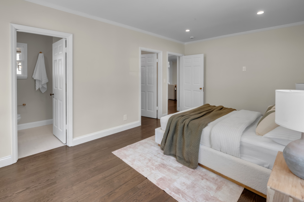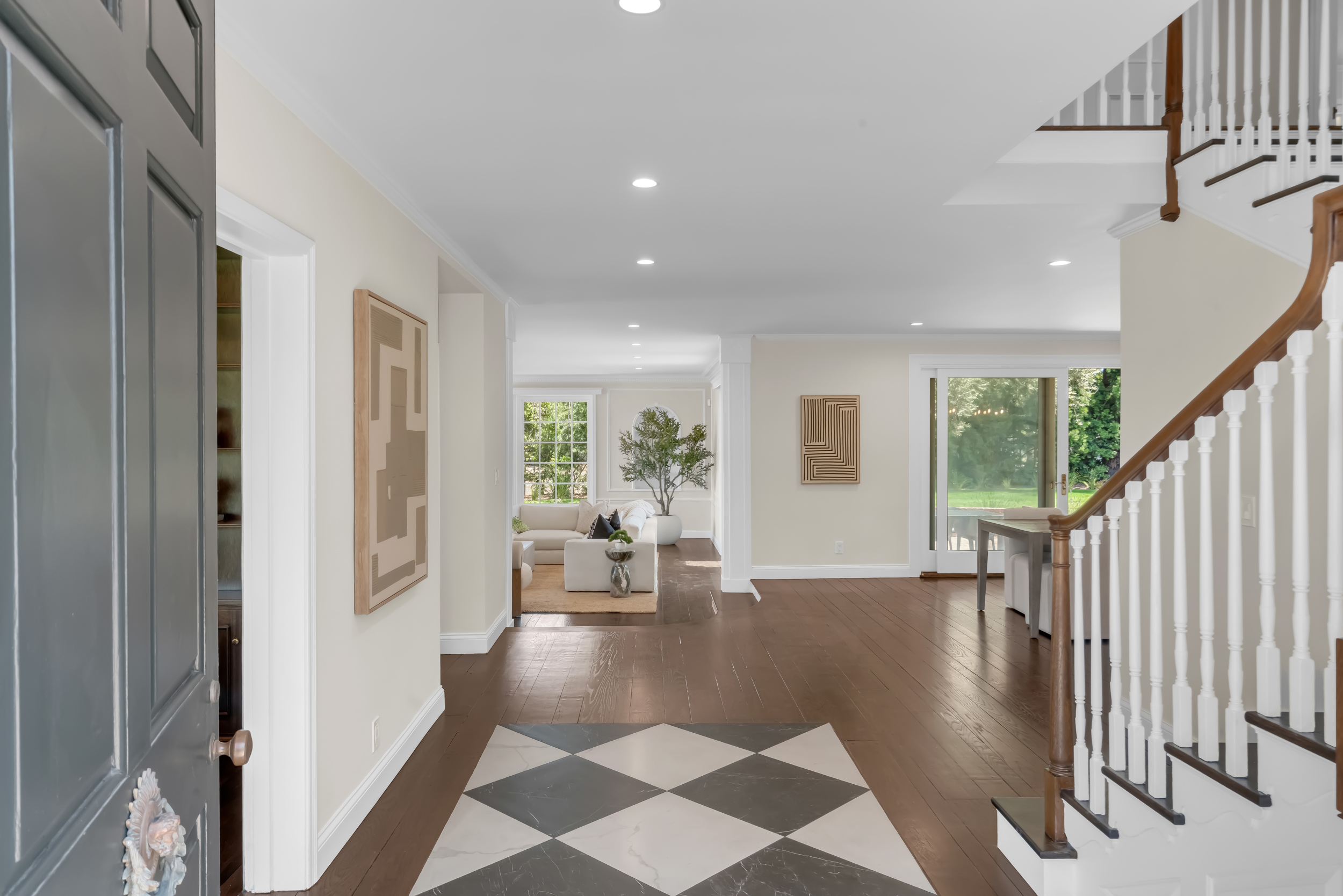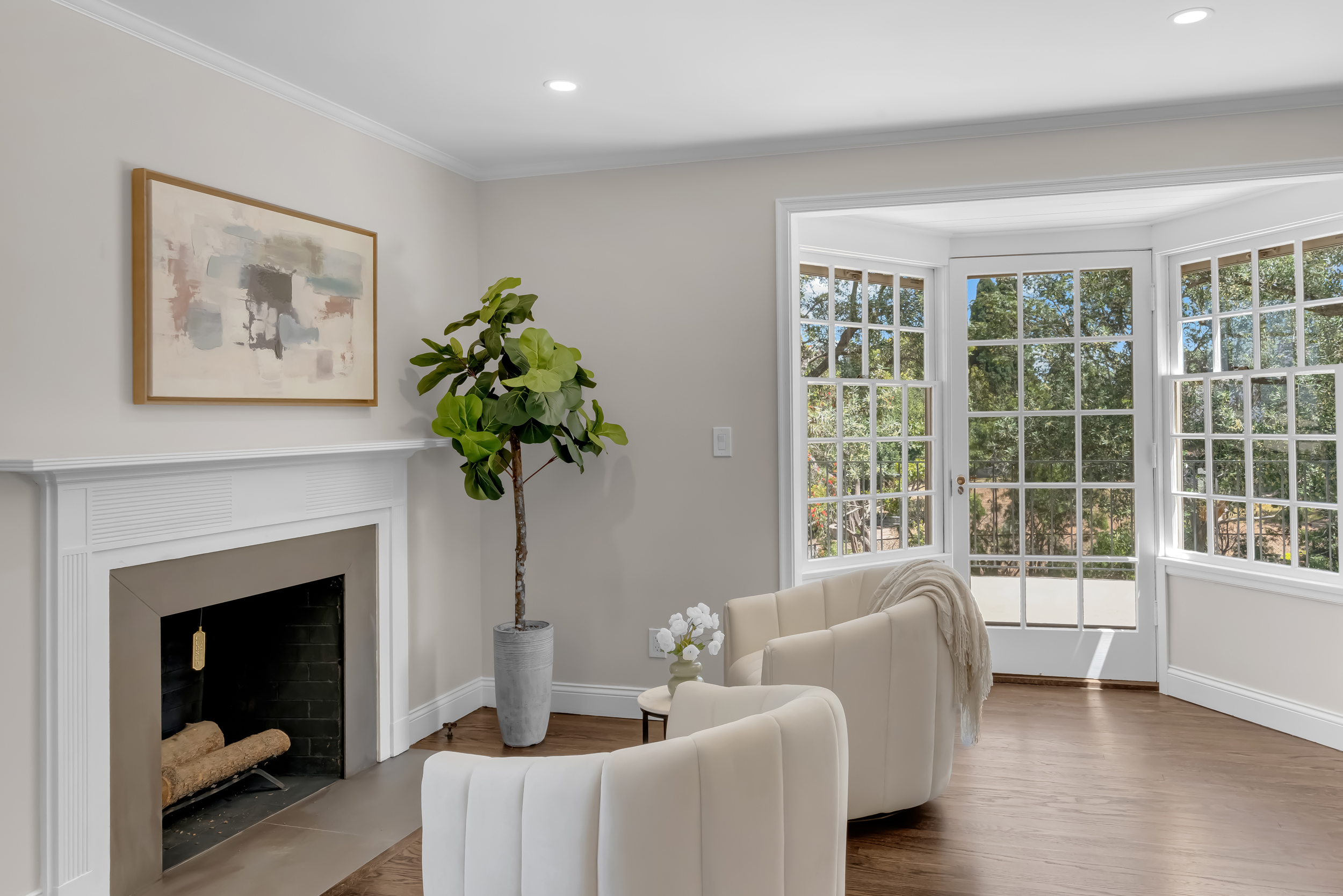 Inside, airy sophistication takes center stage. Natural light floods through oversized windows, illuminating carefully preserved paneling, curated finishes, and hardwood floors throughout. The living room invites connection with its marble hearth and generous proportions, while the dining area flows seamlessly into a chef’s kitchen made for entertaining—complete with a large island, custom cabinetry, and designer lighting.