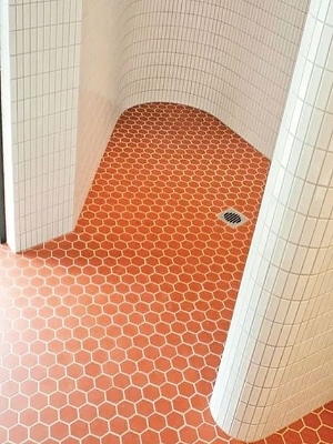 Hexite tile bestows symmetry upon the bathroom floor, embracing clean lines in a nuanced manner. A daring floor color paired with neutral surroundings accentuates the tile’s allure.