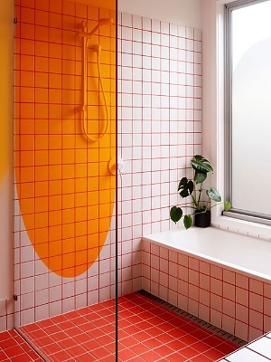 Midcentury patterns are synonymous with playful geometry, and this spirit thrives through hand-painted tile patterns in the bathroom. Oversize polka dots in pink-and-mustard hues lend a nostalgic touch, bridging the era’s graphic design aesthetic with modern sensibilities.