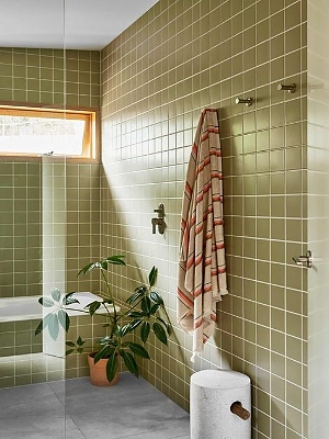Nature-inspired earth tones found a definitive place within mid-century interior design. A primary bathroom exemplifies this connection with its rich green tile, effortlessly melding the outdoors with indoor elegance.
